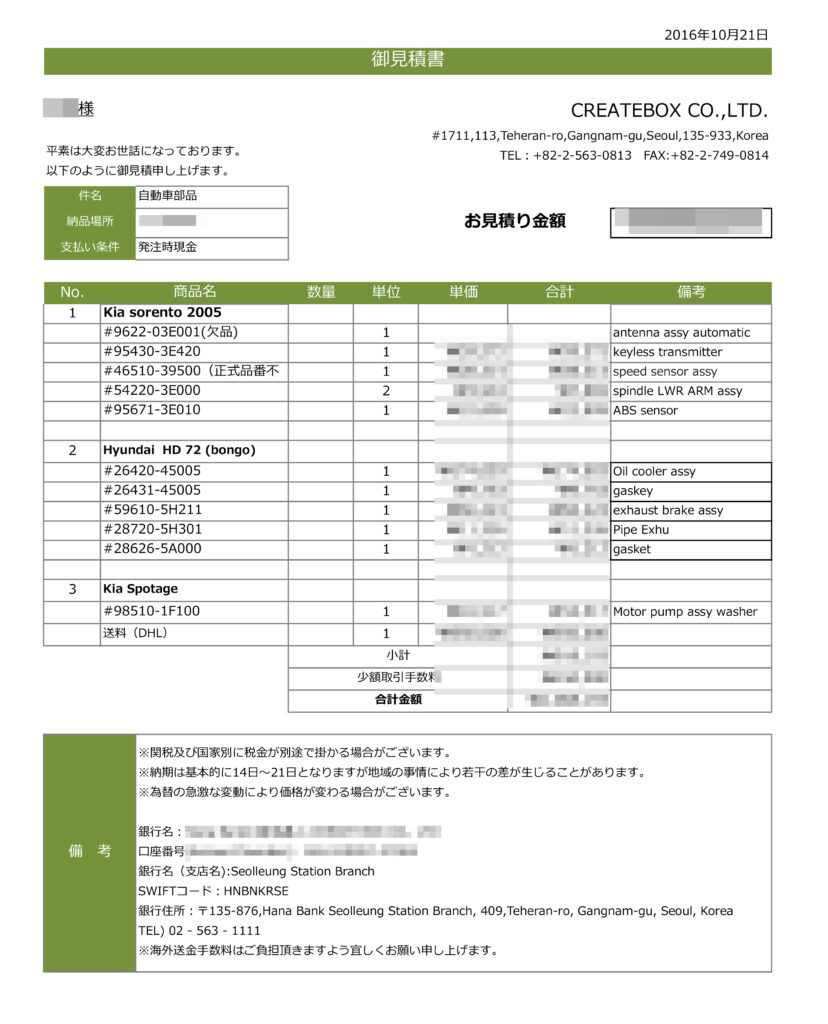 現在、kia, hyundaiの部品の取り寄せを展開しているところなのですが、韓国での部品販売の対応がどこも遅いため、新たに部品販売をし ている方を探しているところです。
